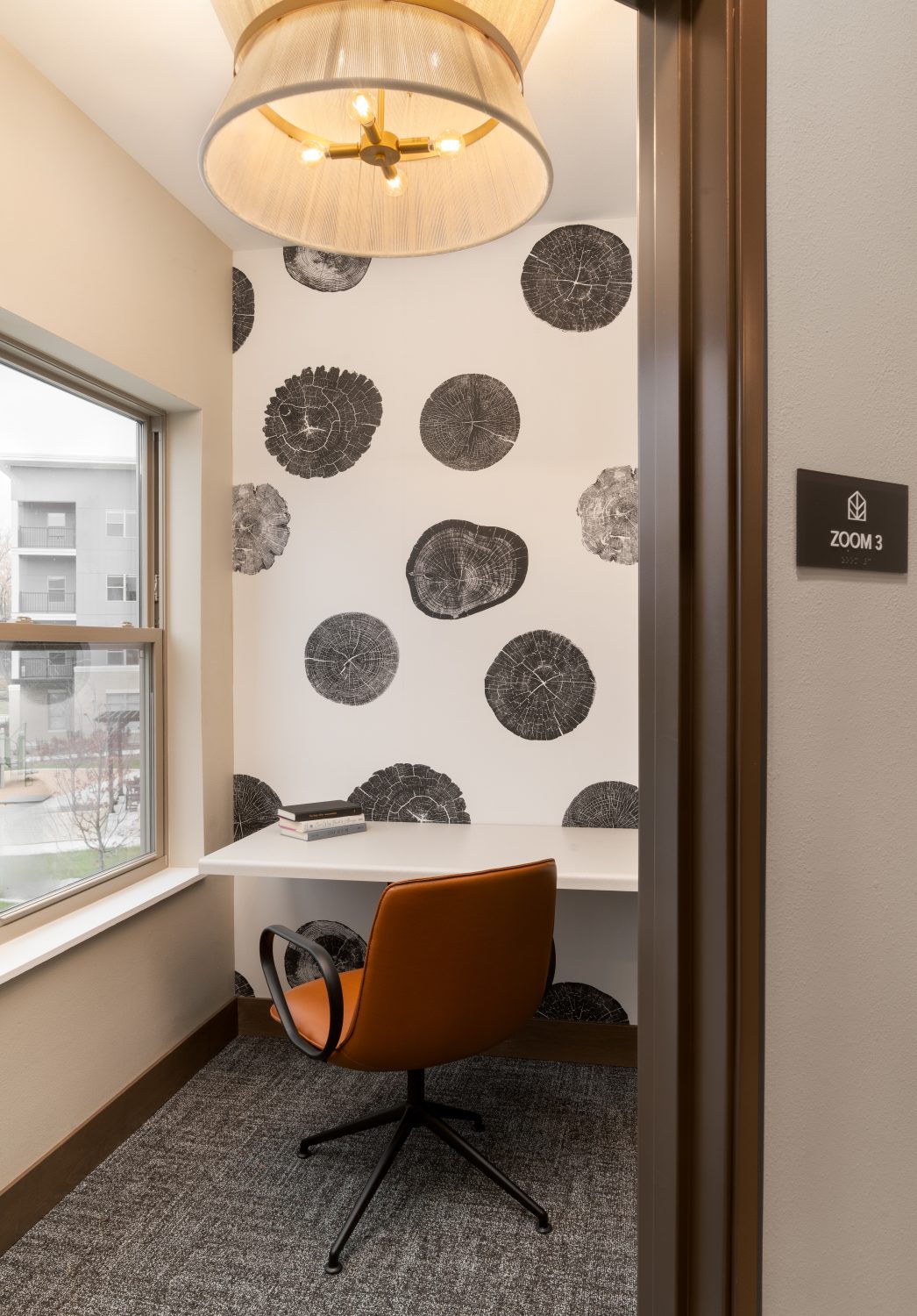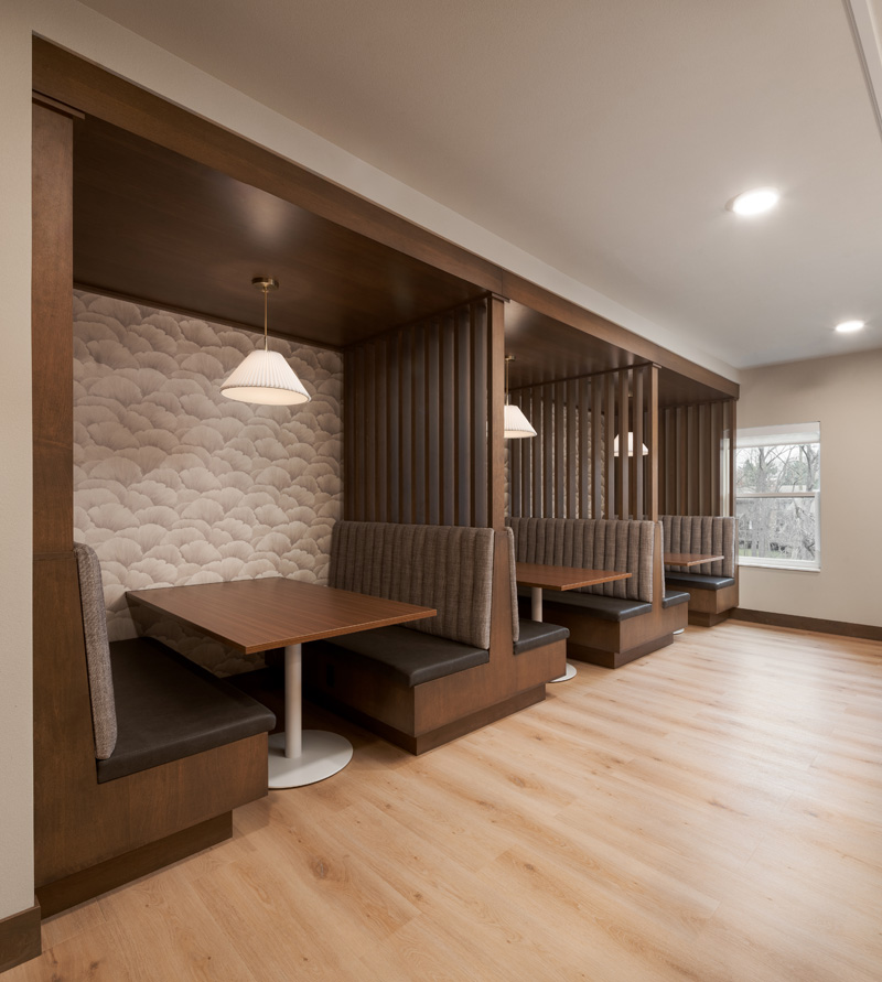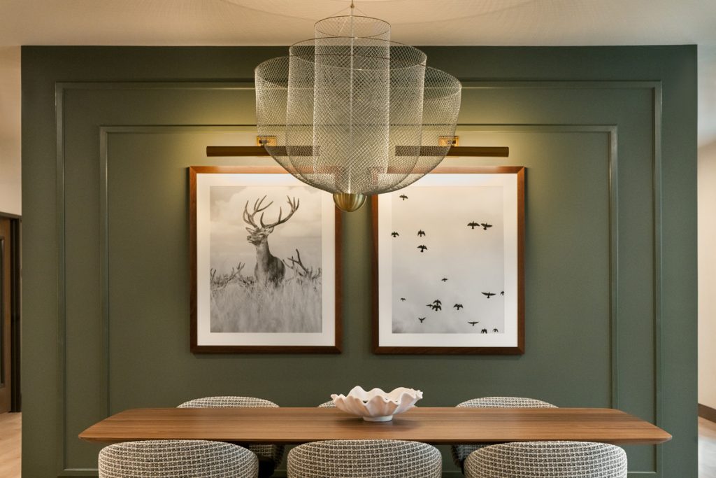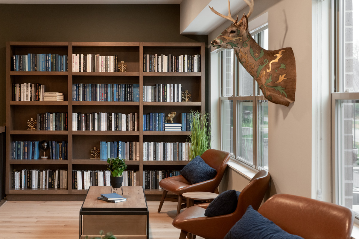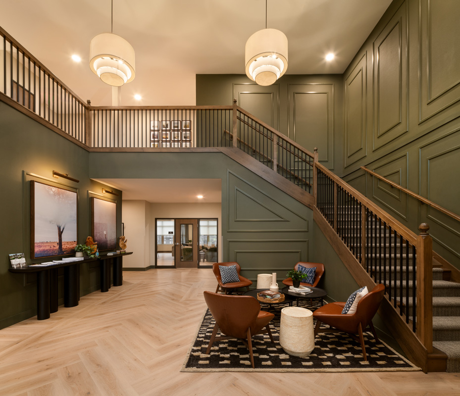 The interior design reflects a timeless yet creative vision inspired by a modern North Woods aesthetic. Earthy tones, accent lighting, and curated local artwork bring warmth and character to each space. Apartment interiors are thoughtfully designed with high ceilings, large windows, spacious closets, luxury vinyl plank flooring and carpet, stainless steel appliances, granite countertops, and in-home laundry—ensuring every detail contributes to a comfortable, stylish living experience.